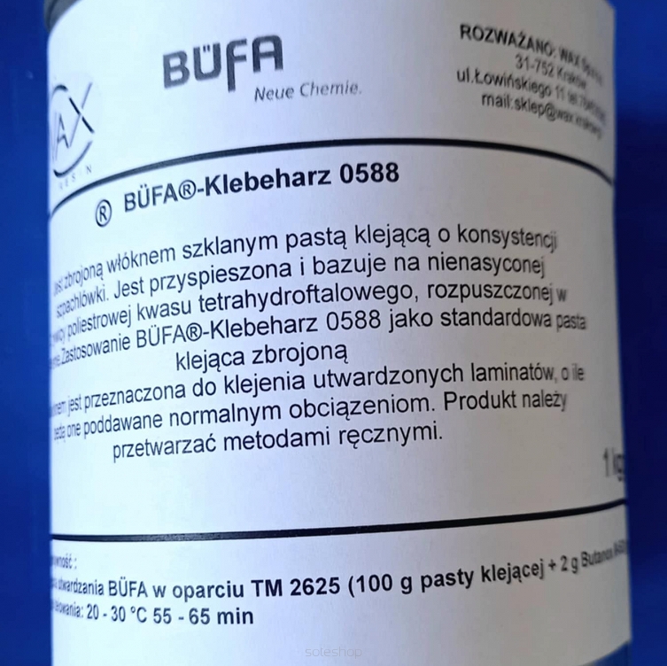 BÜFA®-Klebeharz 0588 jako standardową pastą klejacą zbrojoną włóknem jest przeznaczoną do klejenia utwardzonych laminatów, o ile będą one poddawane normalnym obciążeniom. Produkt ten oskonale nadaje się do klejenia laminatu z drewnem lub metalem, w szczególnosci po użyciuodpowiednich promotorów adhezji.
